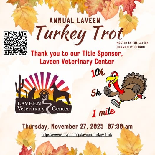 The Laveen Turkey Trot, sponsored by the nonprofit Laveen Community Council, returns on Thanksgiving Day. Choose your course for the Turkey Trot as a 5K, 10K, or 1-Mile turkey run